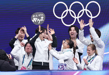 フィギュアスケートは7日、団体が行われ、日本は最終日を残して合計39点で2位となった。写真は男子ショートプログラムで鍵山優真(中央左)の得点が発表され、喜ぶ坂本花織(同右)ら日本チーム=ミラノ郊外 【時事通信社】