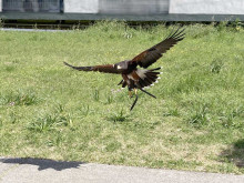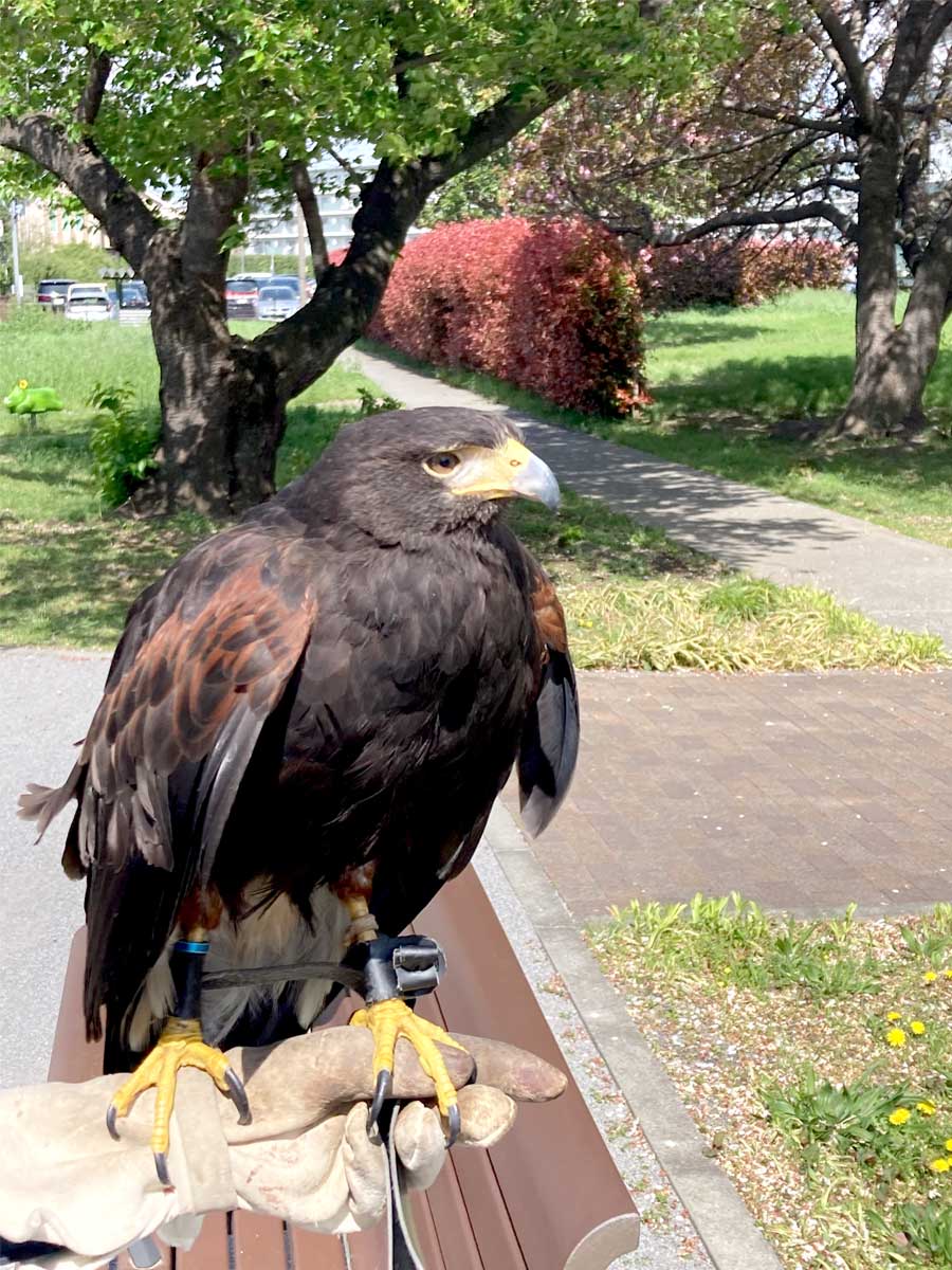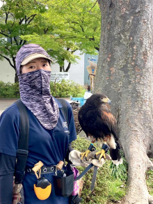 放鷹(ほうよう)による害鳥(カラス・ハト・ムクドリ)の「追い払い」が4月9日、神代団地(調布市西つつじヶ丘4)で行われた。