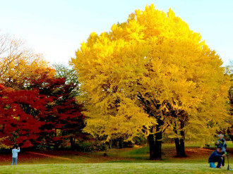 小春日和の11月22日、秋色に染まった都立野川公園では、笑顔で過ごす家族連れのほか、スマホを手に散策するなど紅葉を楽しむ市民の姿が見られた。園内に数本ある大イチョウは黄金色に輝き、見頃を迎えている。輝くイチョウをバックに写真を撮るカップルも。野川沿いには、黄色や赤に色付いた葉と緑のコントラストが鮮やかな雑木林が広がっている。一方、日当たりのいい場所のイロハモミジは、一部に葉焼けが見られた。