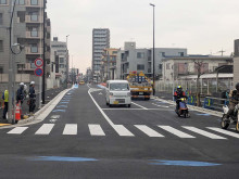 2012(平成24)年から段階的に整備が進められてきた同路線。今回新たに北側の甲州街道から旧甲州街道間と、先行して片側通行が行われていた旧甲州街道から品川通り間を含む約750メートルの全線が相互通行へと切り替わった。品川通りから甲州街道までが一本の道で結ばれることで、鶴川街道や布田南通りの渋滞の緩和や同駅周辺の南北交通の利便性向上が見込まれる。