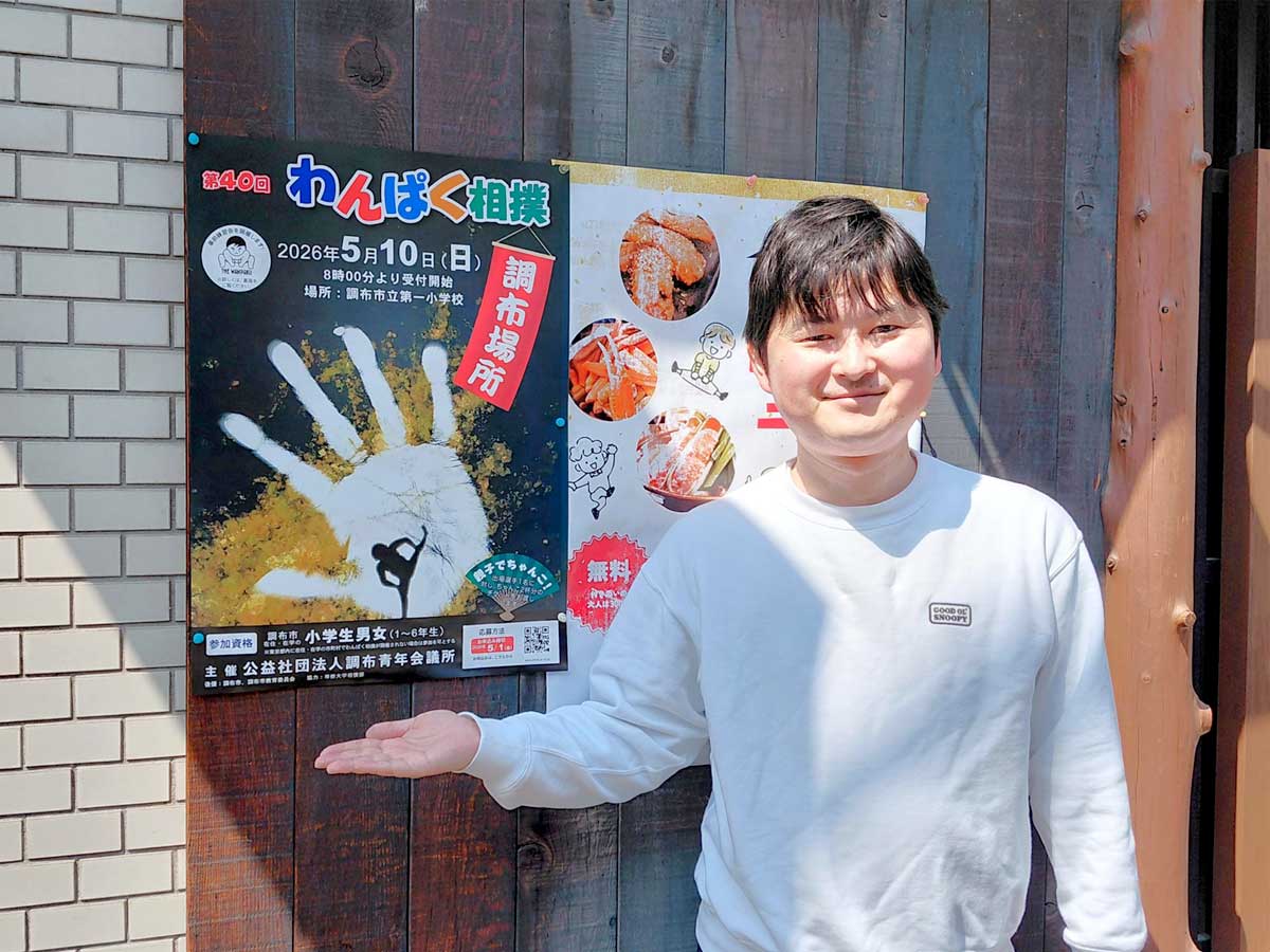 「わんぱく相撲調布場所」のポスターと担当委員長の青山誠さん