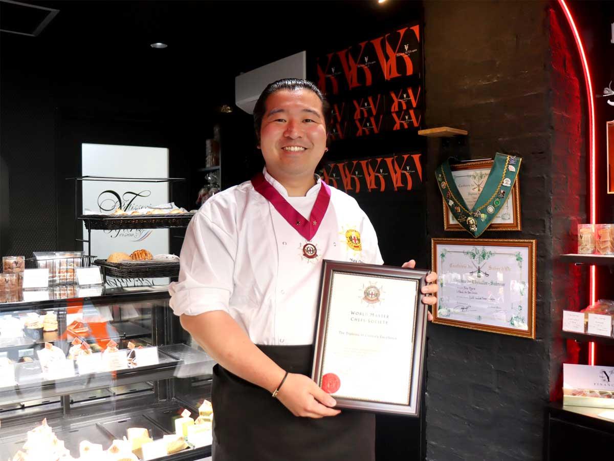 調布市つつじヶ丘駅近くの洋菓子店「Patisserie YUTA ogura vision Y(パティスリー・ユウタ・オグラ・ビジョン・ワイ)」(調布市西つつじヶ丘3、TEL 042-444-0561)のシェフパティシエ小倉優太さんが、国際的な料理人で構成される協会「World Master Chefs Society(WMCS)」のマスター会員に認定され、4月11日、認定証とコックコート、メダルが届いた。