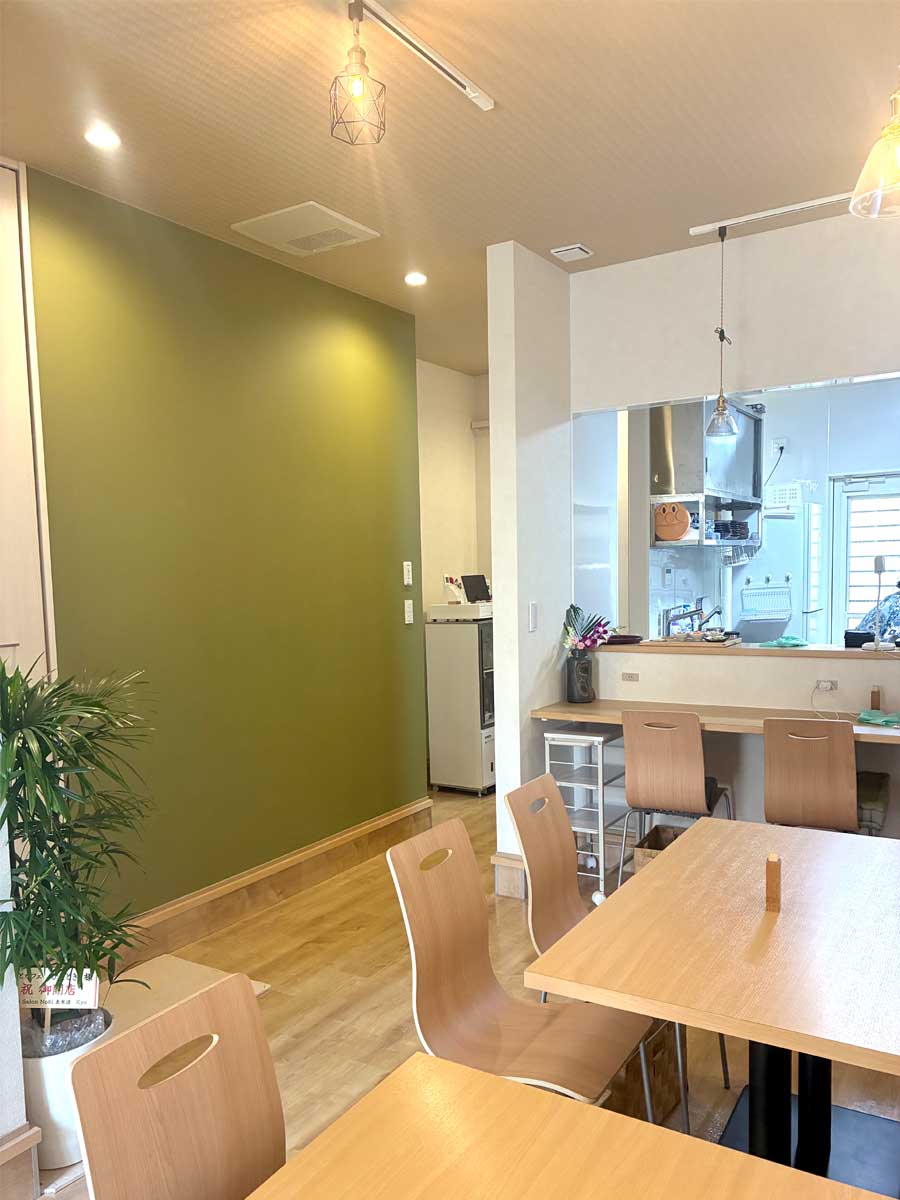 バリアフリー対応の店内 奥の緑の壁一面は子どもが自由に描ける「お絵かきスペース」