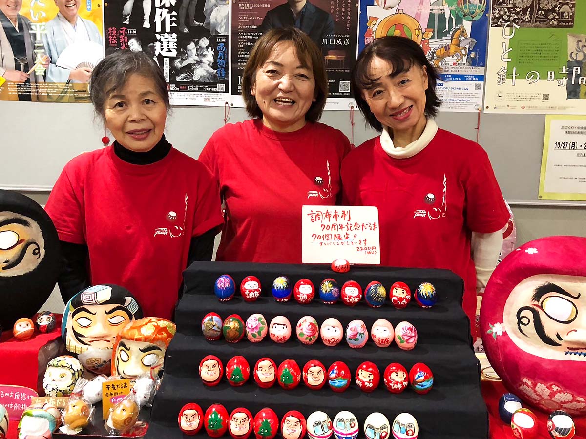 調布市政施行70周年の記念式典に合わせ、調布市文化会館たづくり(調布市小島町2)で10月26日に開催された「Chofu 70th Anniversary FES」で、市政70周年記念のオリジナルミニだるま70体が展示販売された。