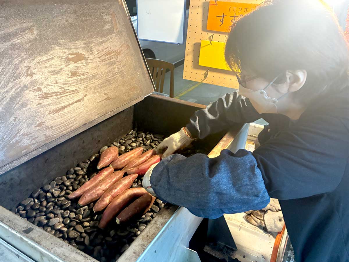 石焼き芋釜でじっくり焼きあげる澄子さん