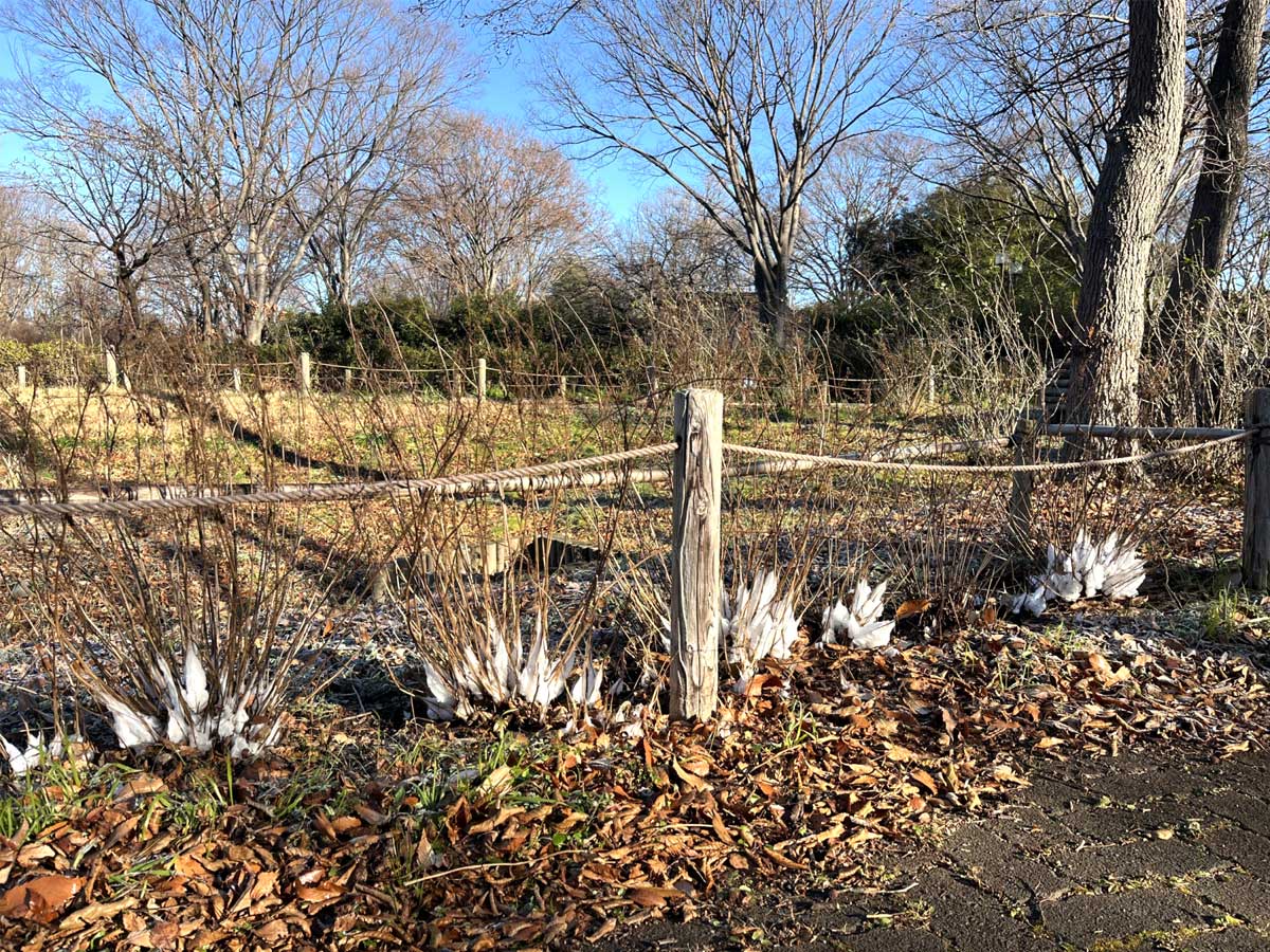 府中市郷土の森博物館(府中市南町6、TEL 042-368-7921)で現在、ろう細工のような「ロウバイ」の黄色い花と、植物「シモバシラ」による氷細工のような白い霜が来園者の目を楽しませている。