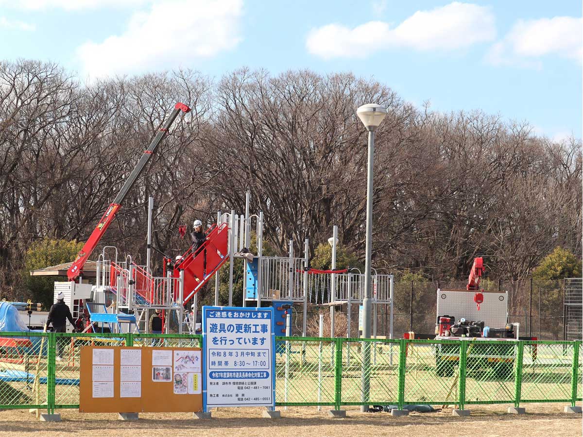 1月から遊具の更新工事が行われている調布・西町公園(調布市西町)で2月2日・3日に新しい大型遊具の設置作業が行われた。