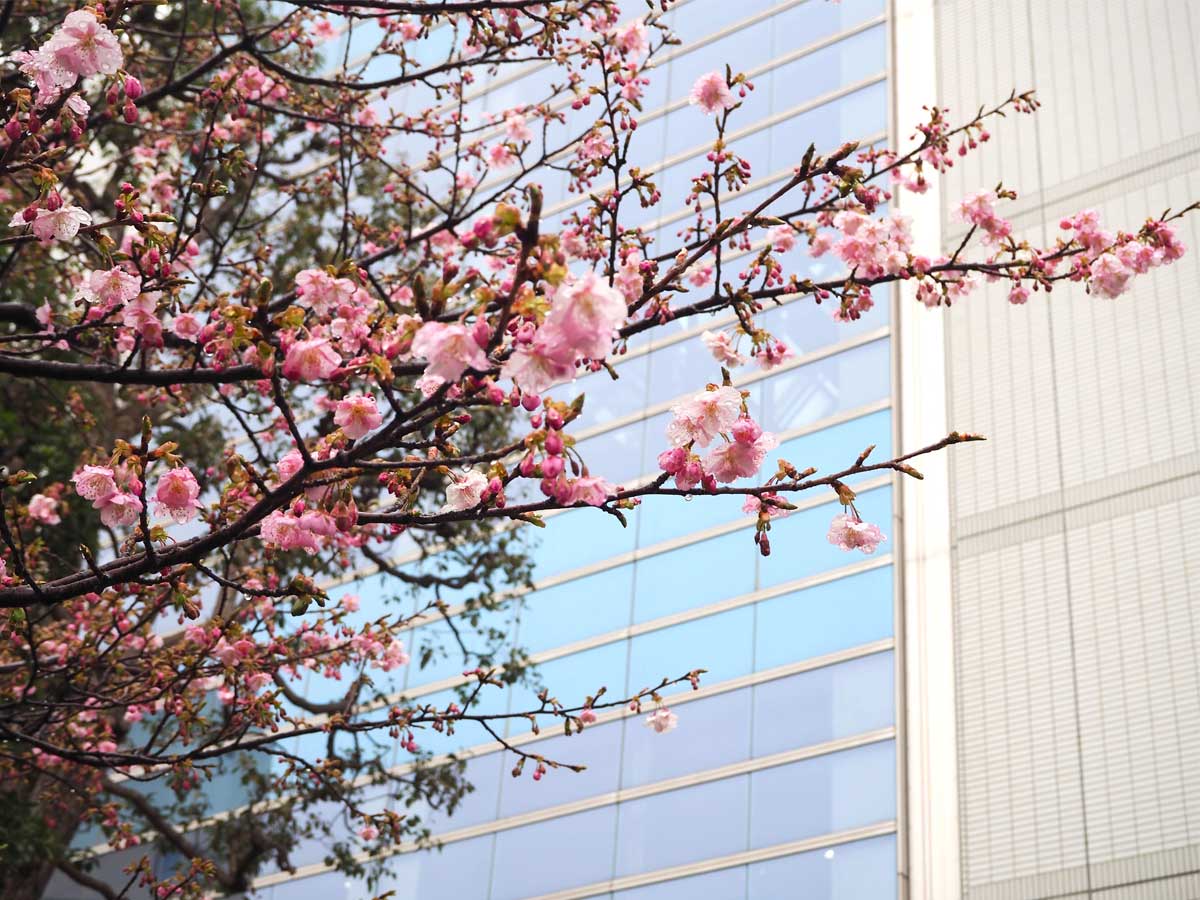 調布市役所の前庭にある早咲きで知られる「河津桜(カワヅザクラ)」が咲き始め、道行く市民の目を楽しませている。