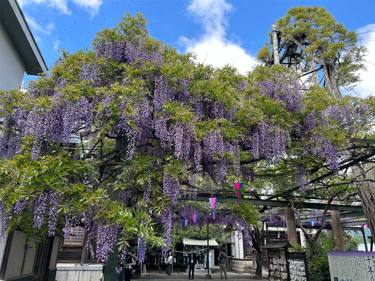 調布・國領神社(調布市国領町1)の神木「千年乃藤」が開花し、4月18日・19日、「国領千年乃藤まつり」が開催される。