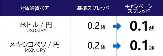 キャンペーン期間中、18:00~21:00の時間帯において、「米ドル/円(USD/JPY)」および「メキシコペソ/円(MXN/JPY)」のスプレッドを0.2銭から0.1銭に引き下げます。対象時間帯の新規約定および決済約定は、キャンペーンスプレッドが適用されます。