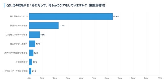 その結果、「特に何もしていない」が64.3%と最も多く、足のトラブルを感じながらもケアに至っていない実態が明らかになりました。