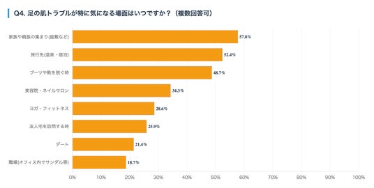 最も多い悩みは「かかとのガサガサ・ひび割れ」(68%)で、「家族の集まり」や「旅行先」といった場面で人目が気になっている方が多いことも分かりました。